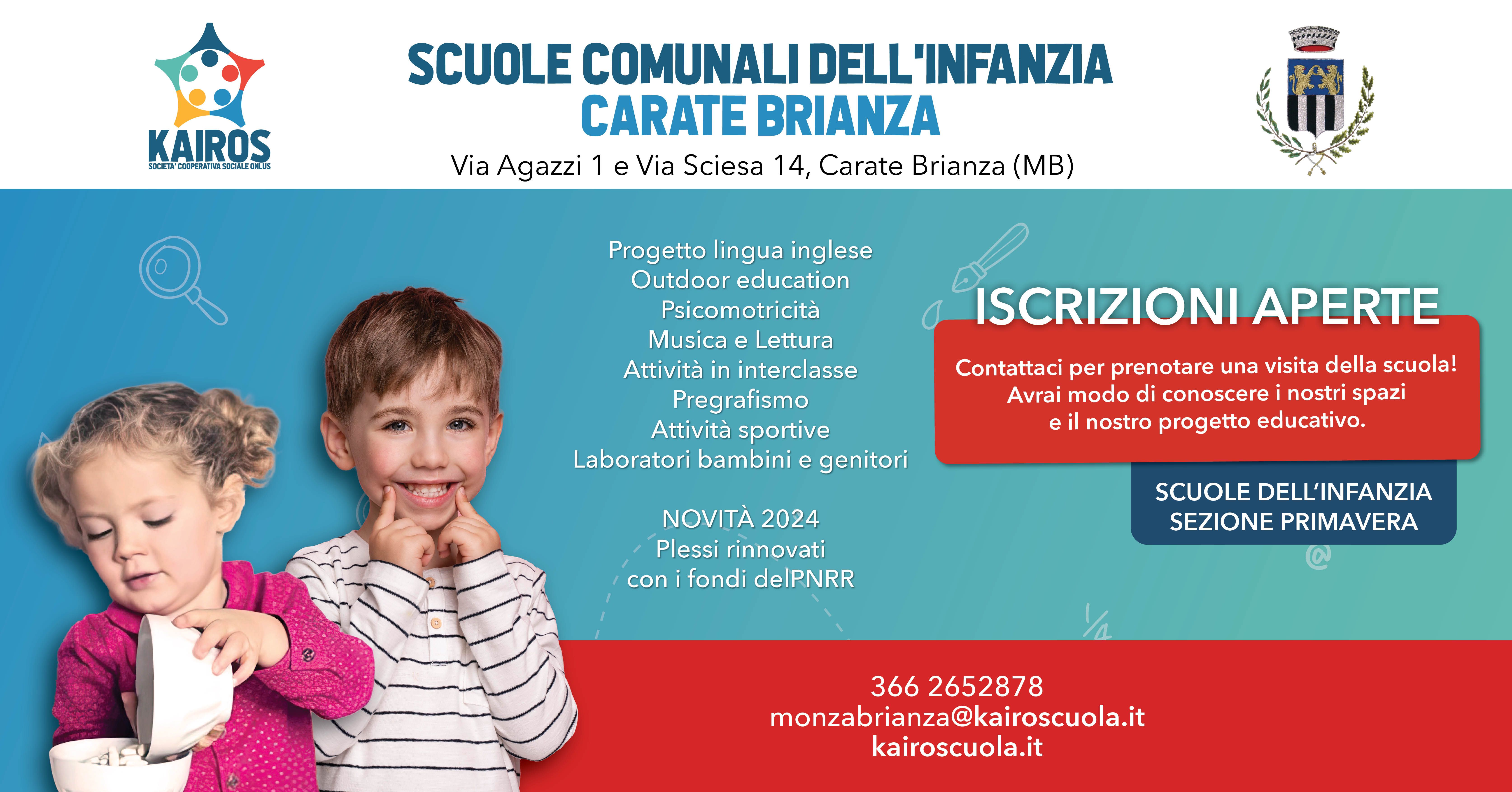 Presso il Comune di Carate Brianza, la Cooperativa Kairos, gestisce l'Asilo Nido comunale "Il mio piccolo nido" e la Scuola dell'infanzia comunale che è divisa in due plessi (Via Sciesa e Via Agazzi)