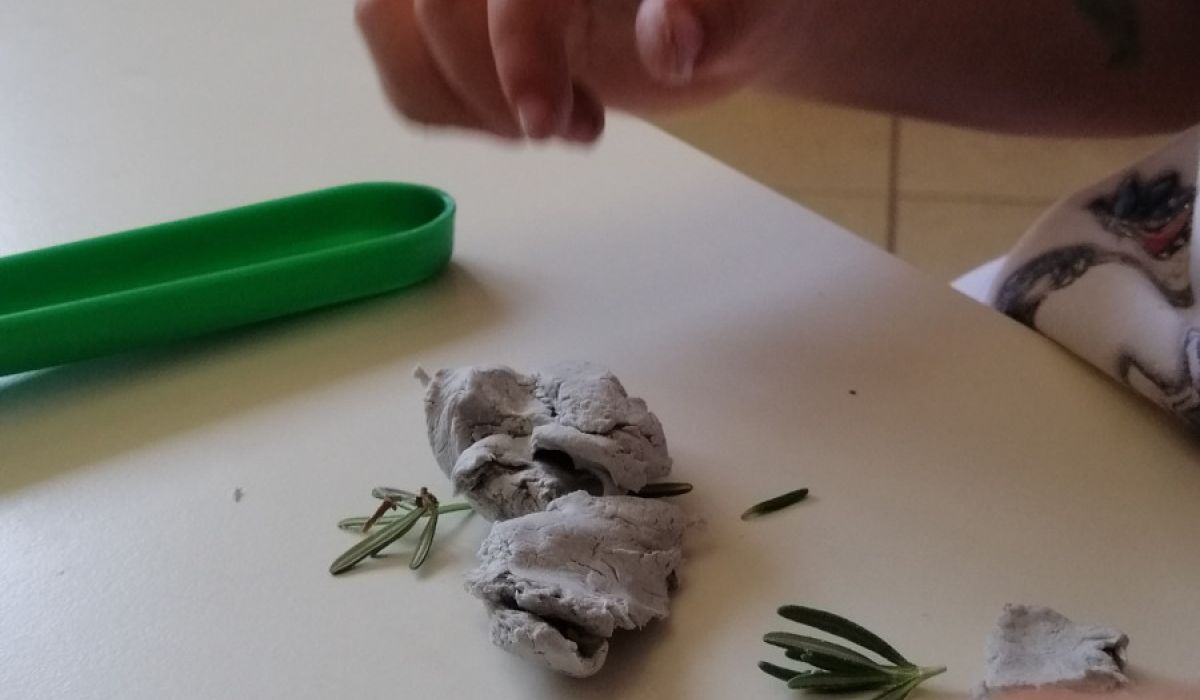 Oggi i bambini hanno giocato con il das e gli strumenti da cucina, ma questa volta abbiamo voluto unirci una nuova esperienza sensoriale. Abbiamo raccolto del rosmarino, lo abbiamo annusato avvertendo tutto il suo forte profumo e infine abbiamo staccato le singole foglie da ogni rametto, notando come sembrassero degli aghi pungenti!
